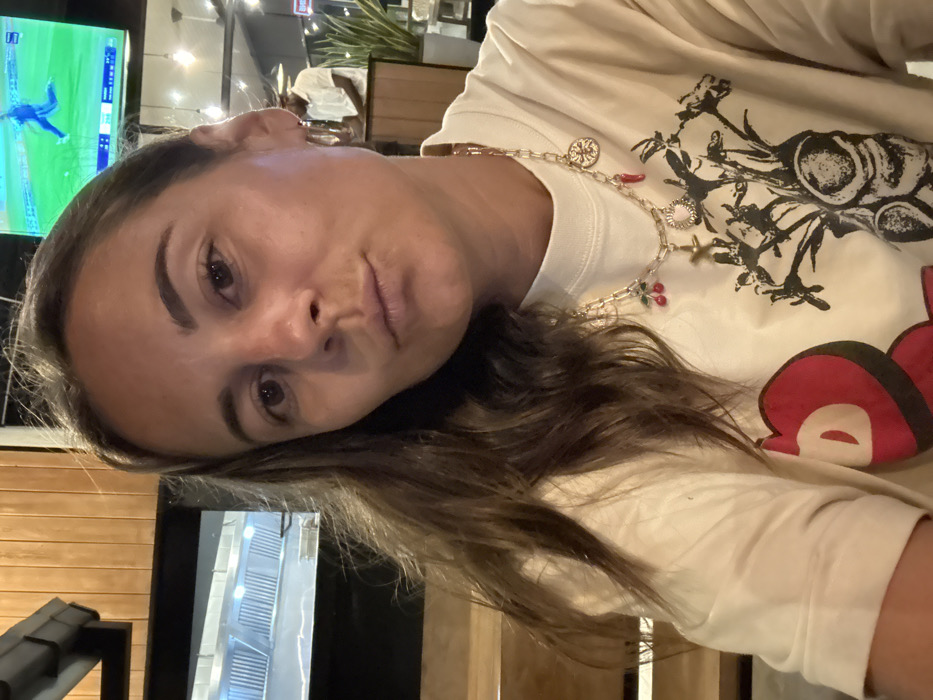 A female subject is depicted in a close-up selfie, looking directly at the camera with a pouting expression. Her long, brown hair is styled down, and she has a tan complexion. She wears a light-colored long-sleeved t-shirt featuring a large red heart graphic on the lower left and a central black-and-white illustration depicting a plant-like form growing from a base resembling a skull or helmet. Around her neck is a gold-colored chain necklace adorned with multiple charms, including red cherries, a gold cross, a white heart, a red chili pepper, and a circular medallion with a compass design. The scene is an indoor establishment located in Thissamaharama, Sri Lanka. Behind the subject's right shoulder, a commercial kitchen with stainless steel equipment and exhaust hoods is visible through a dark-framed window, beneath light brown wooden paneling. Behind her left shoulder, a large television screen displays a sports broadcast, and a male individual in a light-colored shirt is partially visible behind a dark wooden counter. Exposed bulb light fixtures hang from the ceiling, and a potted plant stands to the right of the male individual, indicating a restaurant or bar environment.