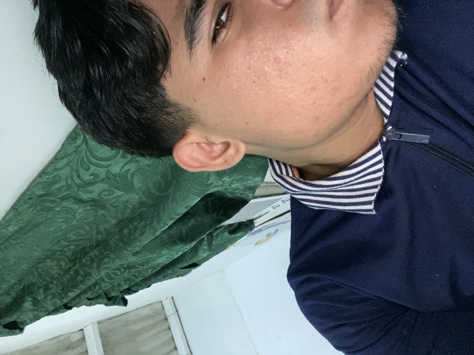 A rotated close-up shows a person with dark hair, brown eyes, and fair skin, wearing a navy blue zip-up jacket with a white and blue striped collar. A green curtain with a patterned design hangs to the left. The person's face is the primary focus, with a view of their ear, cheek, and a slight bit of facial hair. Background details include a white wall with some sort of fixture.