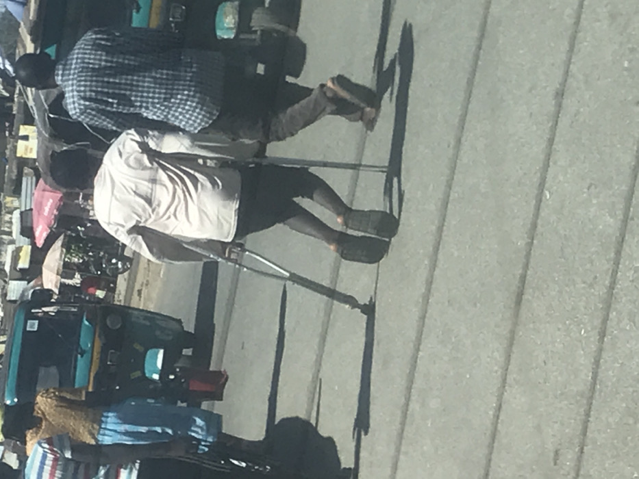 A man with crutches walks on a sunlit road, his shadow visible on the pavement. He wears a light-colored shirt and dark shorts. Another man wearing a plaid shirt walks ahead. Auto rickshaws and a few other people are visible in the background, along with market umbrellas. The view is from an elevated perspective, and the image is rotated.