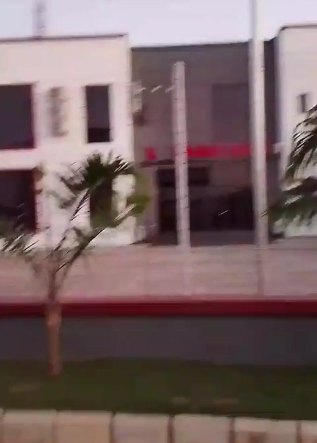 view from a moving vehicle, likely a car, driving along a paved road. On the right side of the road, there is a landscaped area with a low gray wall topped with red trim. There are small palm trees planted in the grass. Behind the landscaping are modern buildings. One building is white with dark tinted windows and an air conditioning unit visible. Another building is gray with red lettering. The entrance to the area is marked by a gray guardhouse with a solar panel on top and a red metal gate. As the video continues, the car passes the guardhouse and a person wearing a bright orange safety vest and light-colored pants is walking on the sidewalk ahead. Other vehicles are visible in the background. The sky is overcast and the lighting suggests it's either early morning or late afternoon.
