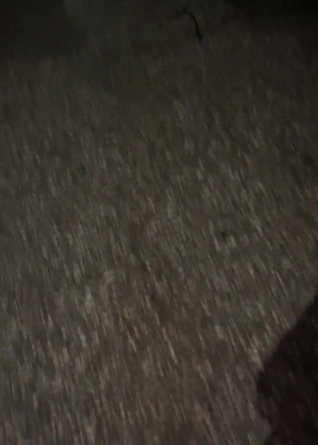 person walking down a dark, wet street at night. The road is paved with asphalt and has several puddles reflecting the light. On either side of the street are dimly lit buildings, mostly single-story houses. A street lamp casts a glow further down the road, illuminating the path ahead. The video is shot from a first-person perspective, showing the person's feet as they walk. The overall atmosphere is quiet and somewhat eerie, with the only visible movement being the person's own steps.