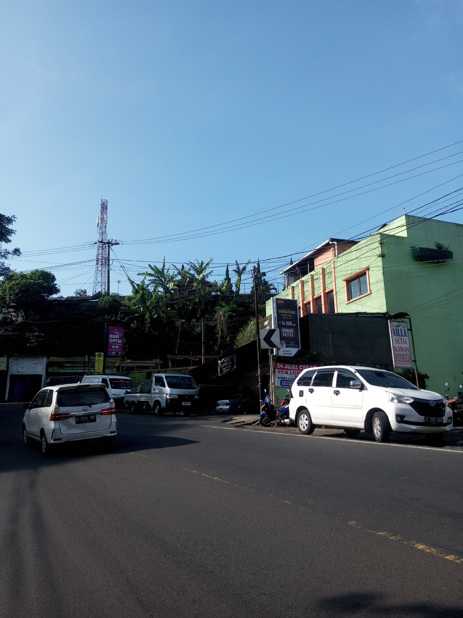 street scene with several vehicles in Indonesia. On the left side of the road, a white minivan with license plate "B 2515 TRT" is driving away. Further up the road, there are other vehicles including a small truck. On the right side of the road, a white minivan with license plate "B 2193 KFK" is parked. Behind the parked minivan is a green building with signs in front of it advertising "VILLA SETIA KAWAN" and "SIGNATURE KRETEK." Other signs include "ASIA OPTIK." A transmission tower is visible in the background.