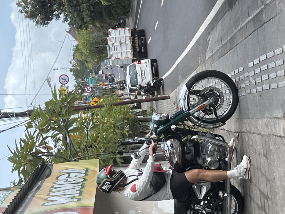 - "A man in a helmet and white shirt sits astride a green motorcycle parked on a concrete sidewalk" by FM-xgQP92, licensed under CC BY 4.0