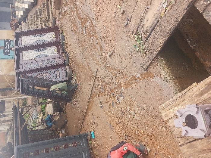 The scene depicts an outdoor commercial or workshop area in Okene, Nigeria. The ground is dirt, extensively muddy with standing water and wood shavings, suggesting recent precipitation or regular wet conditions. In the mid-ground, multiple ornate metal entry doors are prominently displayed upright. These doors feature dark frames (predominantly maroon/dark brown, with one dark gray on the far left) and intricate light-colored, patterned inserts. Several doors are propped against discarded automobile tires. Behind these doors, a light-colored building with a faded blue sign bearing indistinct white script is visible, along with a set of stone steps ascending to the right. Three individuals are present. On the far left, partially obscured by a dark gray door, a person in a red and black long-sleeved shirt and dark sandals is crouched on the muddy ground, facing away from the camera, engaged in an unspecified task. In the mid-ground, a male figure wearing a light olive green shirt and dark trousers stands facing right, appearing to handle or adjust one of the maroon doors. Further left, under a rudimentary shelter constructed from wood poles and corrugated metal, a third male figure in a blue long-sleeved shirt is seated on a large rock, observing the scene. In the immediate foreground, a wide, open trench or gutter filled with dark water and debris is partially spanned by several weathered wooden planks. A light-colored metal object, possibly a portable stove base or burner, rests on these planks. A long metal rod or bar lies horizontally across a wet section of the dirt ground in the mid-ground. The overall environment suggests an active, utilitarian outdoor workspace specializing in metal door fabrication or sales.