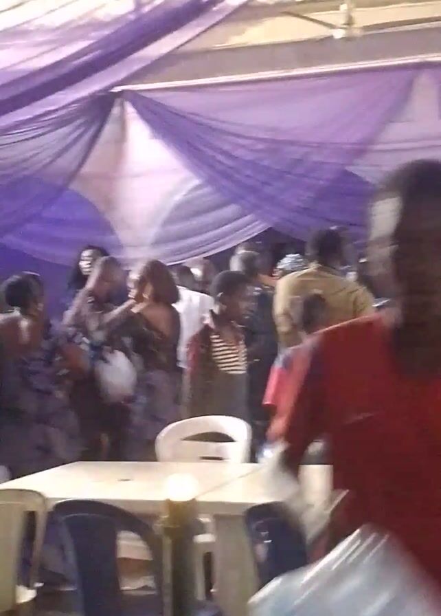 n indoor event space filled with people seated at tables, likely a wedding or banquet hall. The space is decorated with draped purple fabric. People are dressed in a variety of casual and semi-formal attire. They appear to be eating and socializing. The camera angle is angled downwards, providing a view from above. Some water bottles are visible on the tables. The lighting is mixed, with some artificial lights present. The overall ambiance suggests a celebratory event in progress.