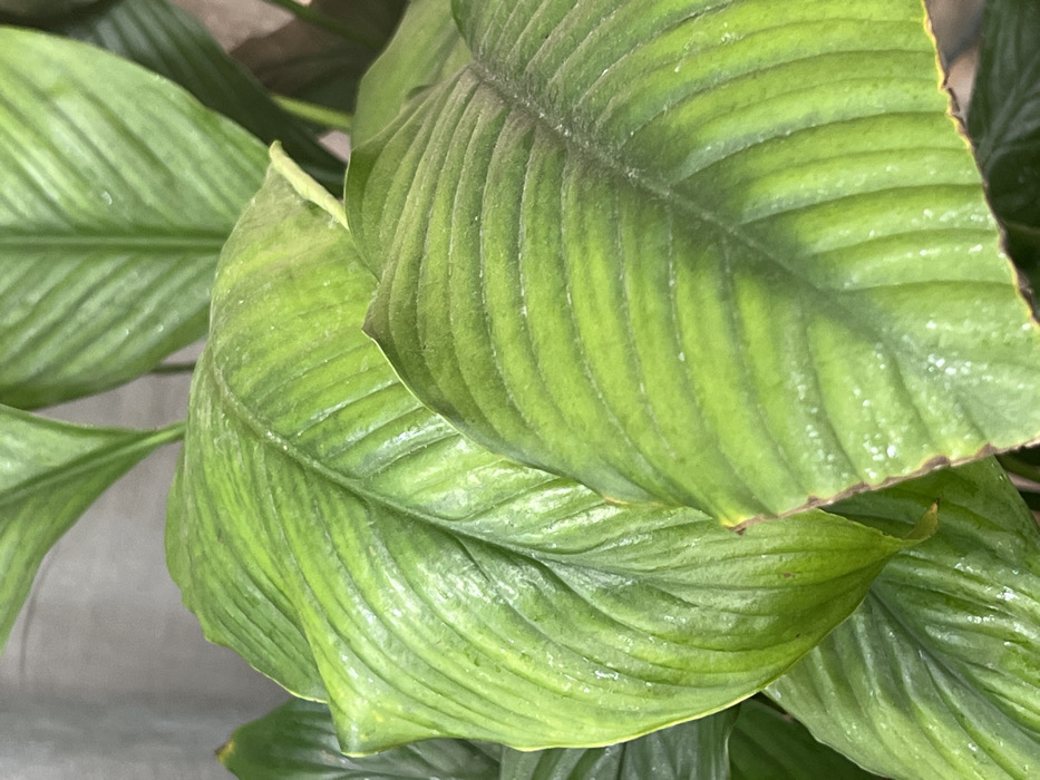 A close-up view presents a grouping of robust green plant leaves, likely from a large houseplant