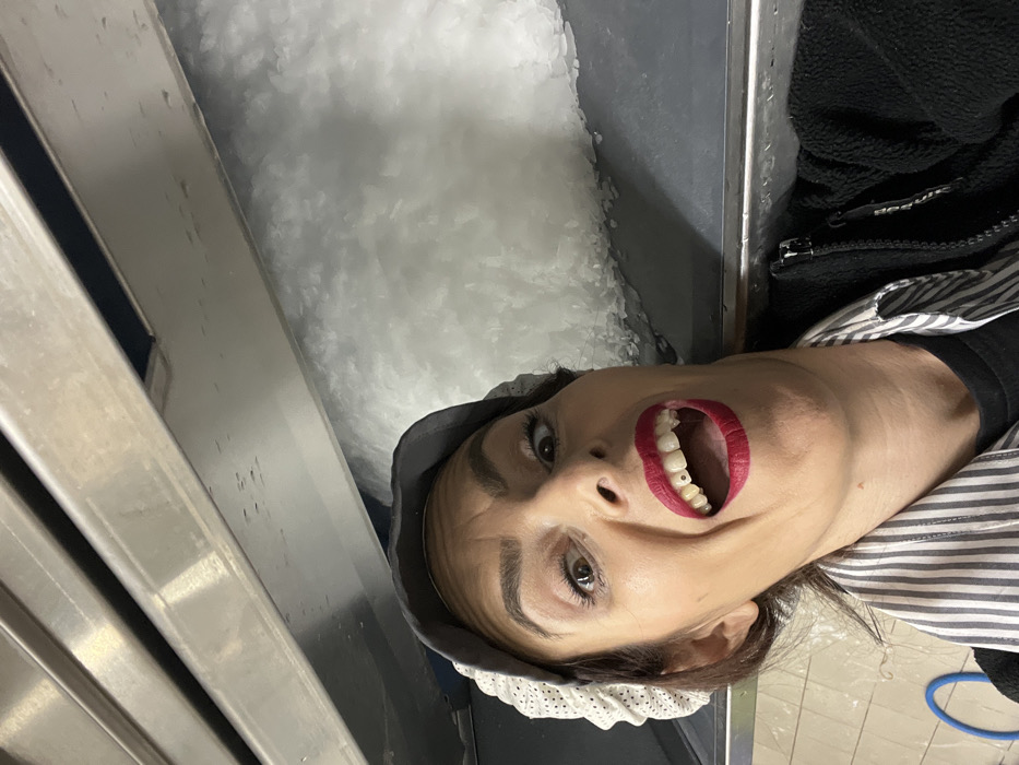 A close-up image shows an adult female positioned prominently in the foreground, with an exaggerated expression, featuring wide eyes and a widely open mouth revealing teeth and a small, clear dental jewel on her upper right incisor. She wears red lipstick, a white textured hair net, and a dark cap, dressed in a striped collared shirt beneath a black zippered fleece jacket. The background indicates an industrial kitchen or service area within Mensdorf, Luxembourg. To her upper right, a large volume of crushed ice fills a metallic, likely stainless steel, industrial ice machine bin, with additional stainless steel panels above. The lower left of the frame reveals a light-colored tiled floor and a segment of a blue hose or cable.