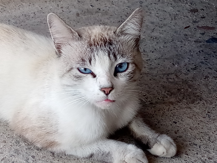 The image displays a single cat lying on a textured, mottled grey concrete or asphalt surface. The animal features predominantly white fur with distinct grey-brown tabby point markings on its ears, forehead, and paws. Its eyes are a bright blue. A small portion of its pink tongue is visible, slightly extended from its mouth. The cat's head is angled towards the viewer, with its body resting on the ground, front paws visible beneath its head. The background is consistent with the ground surface, showing no distinct features beyond its texture and color variations. This scene is located in El Dátil, Venezuela.