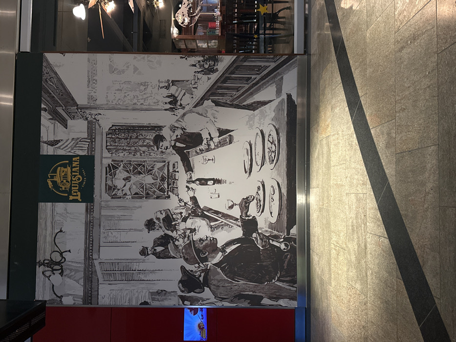 large, predominantly grayscale wall mural located in a modern, light-tiled public interior within Hamburg, Germany. Above the mural, a dark green rectangular sign with gold lettering reads "LOUISIANA SINCE 1994" and features a steamboat logo. The mural depicts a bustling interior scene, likely a bar or restaurant from an earlier era, populated by approximately ten male figures dressed in period attire, including hats and suits. In the foreground of the mural, a man with dark skin, wearing a hat and suit, holds a wine glass in his left hand while gesturing towards several plates containing food (possibly oysters) on a long counter. Other men are gathered around this counter, some holding glasses, engaged in conversation. To the right, a man in a white apron and dark jacket, presumably a bartender or waiter, is pouring liquid from a bottle into a glass. The background details include architectural elements such as intricate window patterns, wall paneling, a chandelier, and an American flag mounted on the wall. To the immediate right of the mural, a glass partition allows visibility into an actual restaurant space furnished with dark wooden chairs and tables. A ceiling fan and a distinctive star-shaped object are also visible within this adjacent area. To the far left, a section of a solid red wall is visible, with a small, brightly illuminated screen displaying colorful animated content. The foreground consists of a light-colored, rectangular tiled floor, traversed by a prominent, dark, diagonal shadow stretching from the lower left to the center right of the frame.