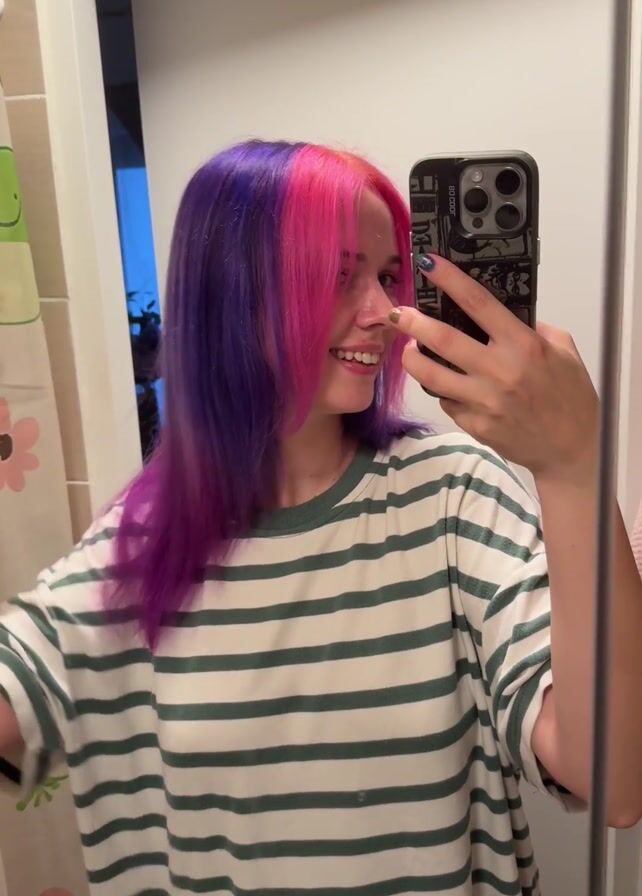 A young woman stands in a bathroom, taking a selfie in the mirror. She has shoulder-length hair that is dyed purple on one side and pink on the other. She is wearing a white and green striped T-shirt. She smiles and touches her hair as she takes the picture. The bathroom has white walls and a white door. A shower curtain with green frogs and pink flowers is visible in the background. She is holding an iPhone with a black case. Her nails are painted. The lighting is bright and artificial.