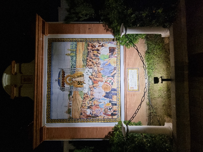 - "This image captures an illuminated outdoor tile panel monument at night, located in a public space within Moguer, Spain" by FM-PLHj72, licensed under CC BY 4.0