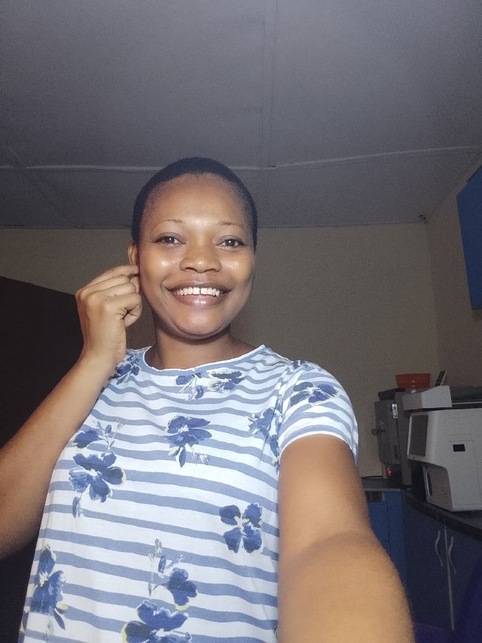 An adult female is depicted in a close-up, indoor, portrait-style photograph. She has dark, very short hair and a light brown complexion, smiling broadly directly at the camera, revealing white teeth. Her right hand is raised, with fingers touching the area around her right earlobe. She is wearing a short-sleeved top patterned with horizontal white and light blue stripes, interspersed with scattered dark blue floral designs. The background is an interior space, consistent with a residential or office environment in the city of Lagos, Nigeria. The walls are painted a light, neutral color, and the ceiling is white with visible paneling or seams. To the subject's right (viewer's left), a dark, vertical element suggests a doorframe or piece of furniture. To the subject's left (viewer's right), a light-grey office machine, possibly a printer or copier, is visible on a dark countertop. An orange bowl rests on the countertop near the machine. Below the counter, a section of blue cabinetry is present. The lighting is artificial and generally even on the subject, with the background appearing slightly dimmer.