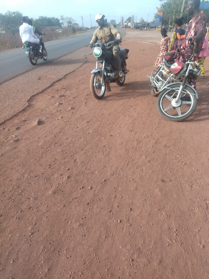 dirt road in Tuoniako, Nigeria. The road is red and has tire tracks in it. There are two men on motorcycles. One is wearing a white shirt and a white cap and has a passenger on the back. The other man is wearing a green and yellow shirt, a white cap, and is driving alone. There are four children standing on the dirt road. Three are wearing blue shirts and a fourth is wearing a pink shirt. Two of the children are sitting on the back of a third motorcycle. The motorcycles are parked on the dirt road and the people are standing or sitting on the road or sidewalk. All the people are facing towards the camera. The ground is covered in red dirt, and the sky is clear and blue.