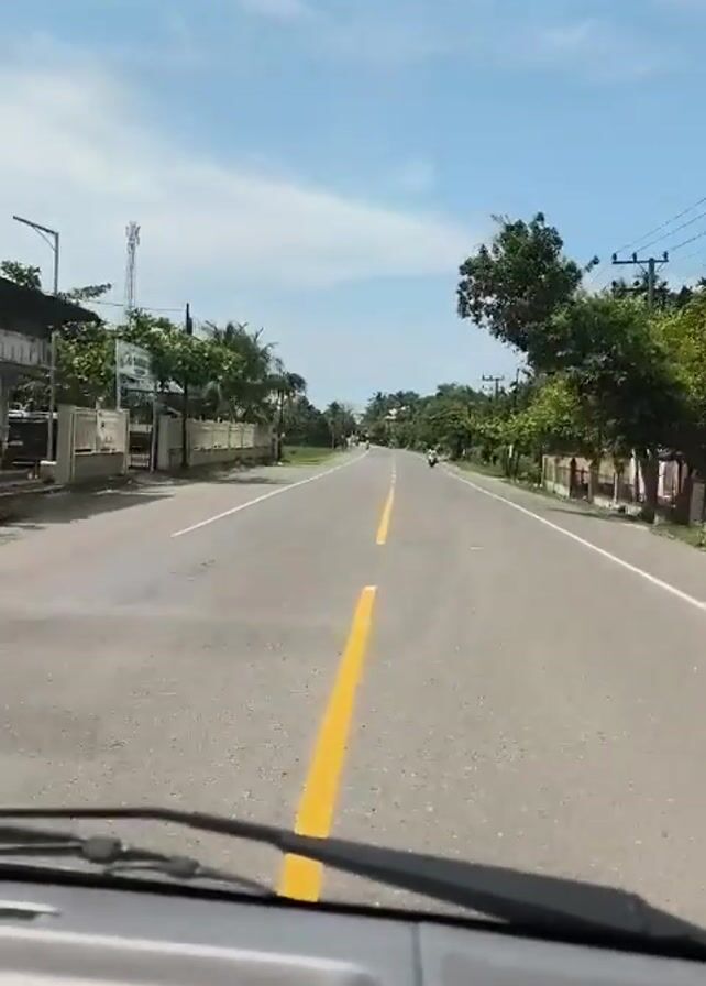 Here's a detailed description of the video: The video shows a view from inside a vehicle driving down a paved road