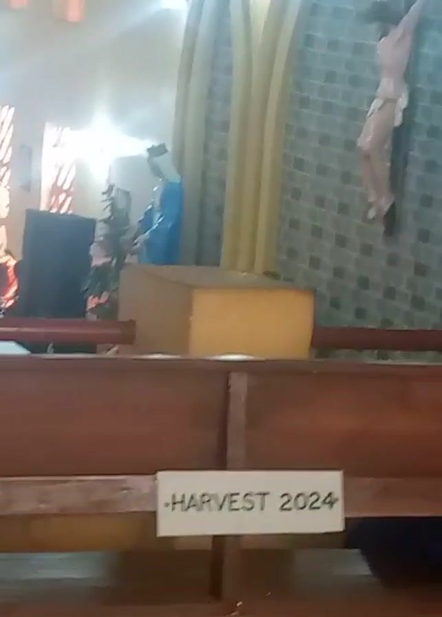 interior of a church. Pews with a sign reading "HARVEST 2024" are visible in the foreground. A crucifix is mounted on a brick-patterned wall in the background. A statue of Mary and a speaker are near the front of the church. An individual wearing a blue head covering is seated in a pew. The lighting is bright and the camera shakes slightly.