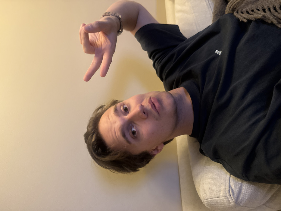 A fair-skinned man lies on a beige sofa, facing the camera upside down. He wears a black long-sleeved shirt with small white text near the collar. His light brown hair is slightly disheveled. He makes a hand gesture, extending his index and middle fingers while curving the other fingers towards his palm. A silver bracelet adorns his wrist. The background consists of a beige wall on the left.