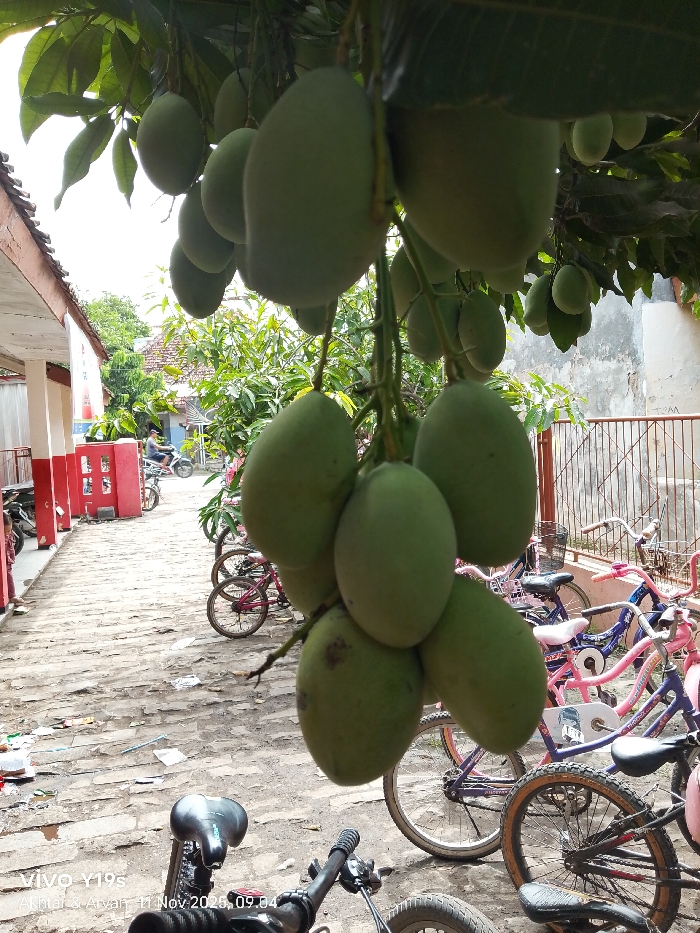 A cluster of green mangoes hangs from a tree branch. Below, a collection of bicycles in various colors and sizes line a brick path. In the background, a red and white building and a fence are visible. A motorcycle is parked nearby, and a person rides another motorcycle further down the street. The overall scene appears to be an outdoor space in a residential area.