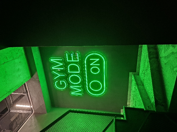The scene captures an interior view of a facility in Plovdiv, Bulgaria, enveloped in intense green neon light. A prominent green neon sign is mounted on a dark wall, displaying "GYM MODE" on its upper line and "ON" within a horizontal oval on its lower line, resembling a digital switch. No individuals are present. In the foreground, a set of ascending stairs with visible treads and risers, likely stone or marble, are heavily illuminated by the green light. A dark metal mesh railing runs alongside the stairs on the left. An upper level or mezzanine, also with a dark metal mesh railing and a vertical white strip light, is visible in the upper left section of the frame. The dominant green lighting creates a monochromatic atmosphere within the industrial-style interior.