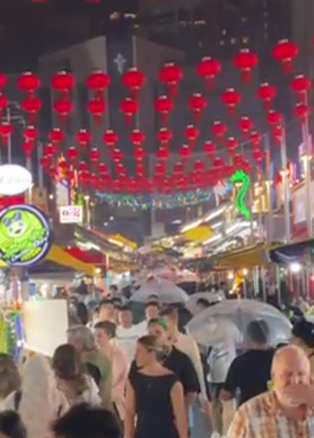 crowded street market at night. Red lanterns hang overhead, creating a canopy above the bustling crowd. People of diverse ethnicities stroll through the market, some holding umbrellas. Stalls line the sides of the street, illuminated by bright lights. Many buildings surround the marketplace.