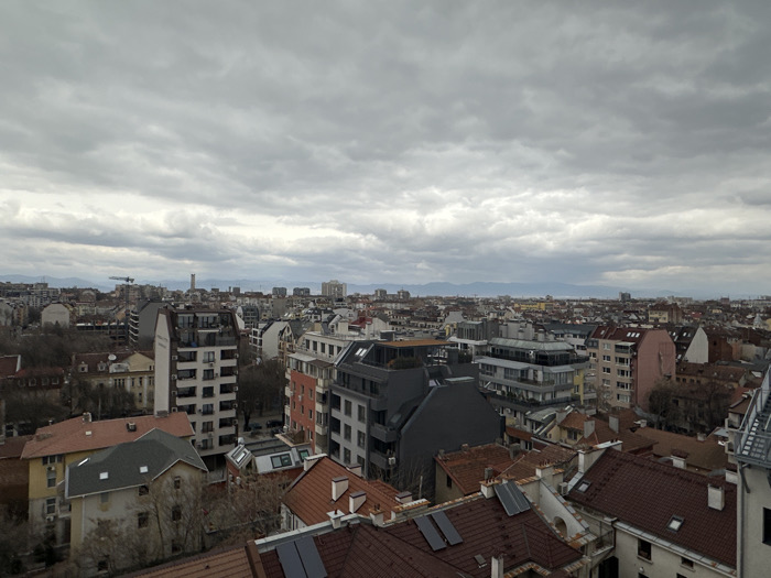 The image displays a high-angle panoramic view of the city of Sofia, Bulgaria, under a heavily overcast sky