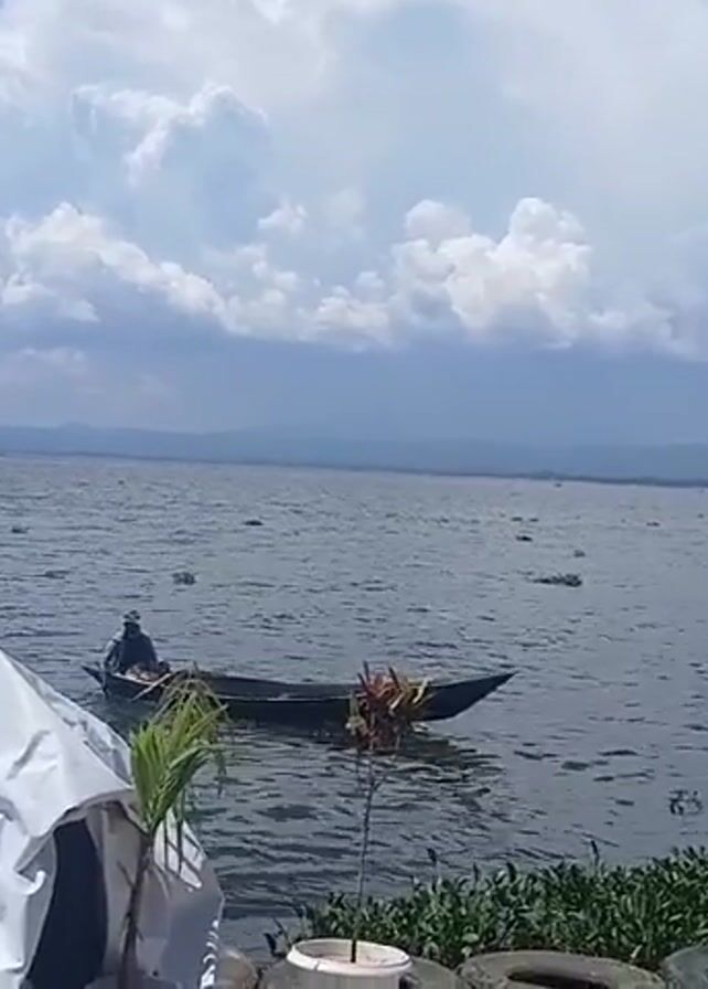 The scene presents a serene lakeside view under a sky filled with fluffy white clouds. In the distance, hazy mountains form the horizon. The lake itself is calm, with some floating plants. A small, dark boat carrying a single person is visible on the water. The person is rowing the boat. In the foreground, a white cloth covers something, and a small potted plant sits nearby. A few tires rest on the ground, and some greenery is visible as well.