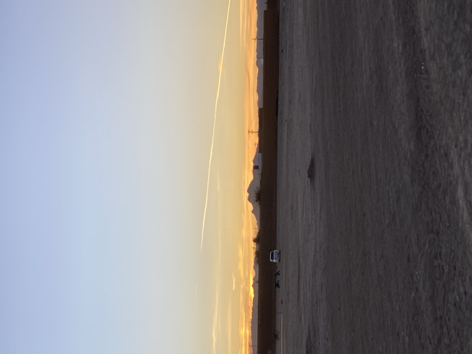 A landscape view shows a sunset with a jet stream across the sky. Mountains are on the horizon. A parking lot occupies the foreground, separated from the sky by a thin line of trees. A white van and several motorcycles are parked near the trees. The sky transitions from blue to yellow, indicating either sunset or sunrise. The overall scene evokes a sense of tranquility and stillness.