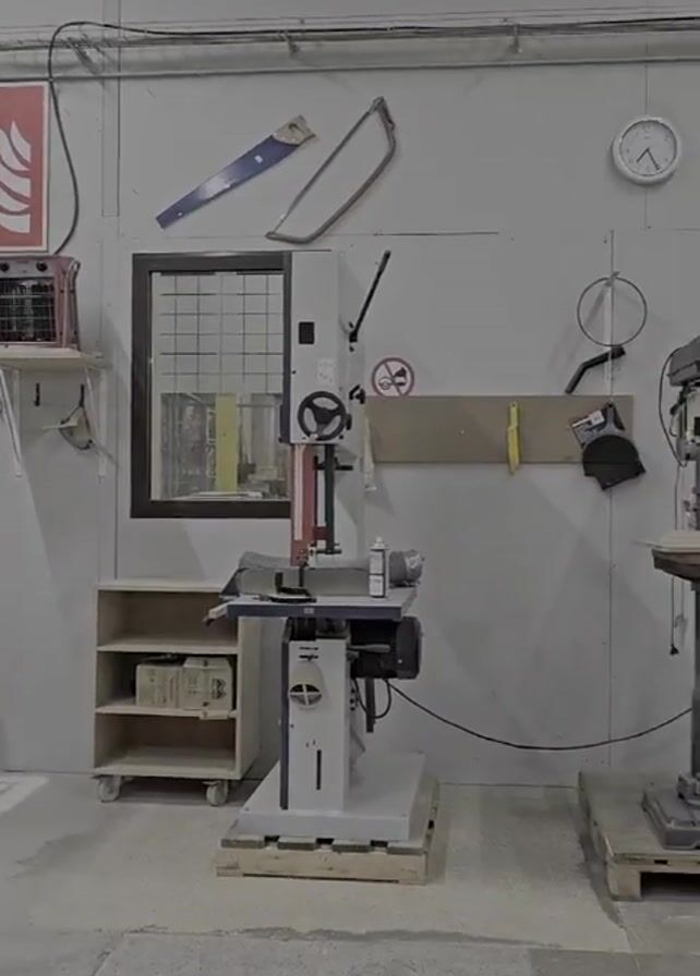 panning shot of a woodworking shop. Various power tools, including a band saw, drill press, and table saw, are visible. There are wooden frames in progress. Shelving units with boxes are in the background. Worktables are scattered with tools. The shop has white walls and concrete floors.