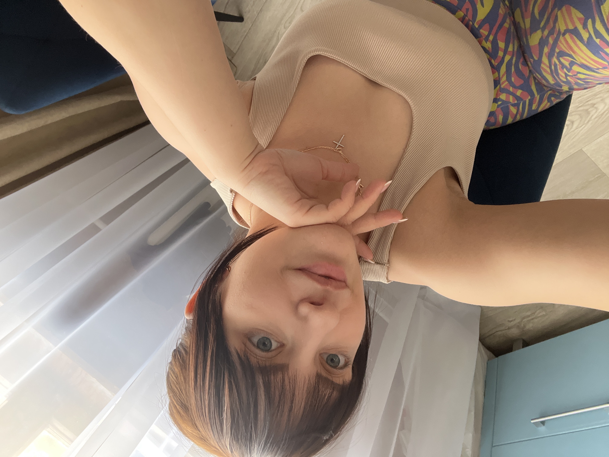 A woman with fair skin, blue eyes, and dark hair with bangs poses for a selfie. She wears a tan ribbed tank top and a delicate gold necklace with a cross pendant. Her left hand is raised near her face. The background includes a blue chair, a cushion with a colorful pattern, white curtains, a blue cabinet, and a light-colored floor. The location is not specified, but the request mentions Марковский, Russia.