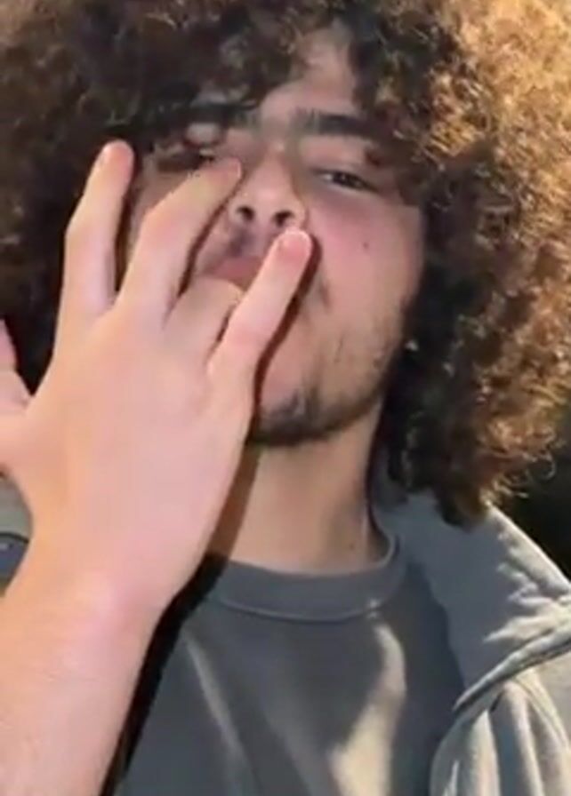 A young man with dark curly hair and a light beard is shown from the chest up. He is wearing a gray t-shirt and a gray zip-up jacket. He puts his fingers in his mouth and makes a face like he is disgusted. The background is blurry and out of focus, suggesting the video was taken indoors.