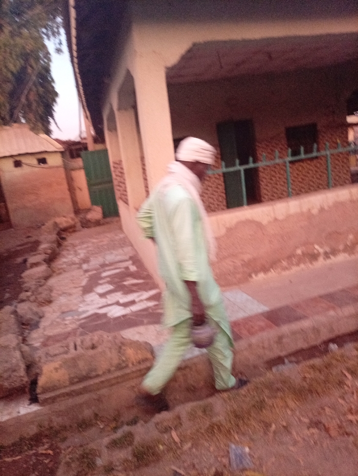 The scene is captured outdoors in Zaria, Nigeria. An adult male subject is in motion, walking from right to left across the frame. He is wearing a light green long-sleeved tunic (kaftan) and matching trousers, with a white headwrap and a white cloth draped around his neck. In his right hand, he carries a small, dark, pot-like container. His movement is slightly blurred. The ground consists of reddish-brown dirt with sparse dry grass, bordered by a raised concrete or stone curb and a shallow, dark channel. To the left background, a smaller, light-colored building with a dark roof and a prominent dark green door is present, adjacent to some trees. To the right background, a larger structure with light-toned walls, featuring at least two arched openings and a recessed interior, is partially visible. A dark green metal fence or railing runs along the front of this building, which also exhibits a textured or patterned wall section. The lighting suggests natural ambient light, casting warm tones across the scene.
