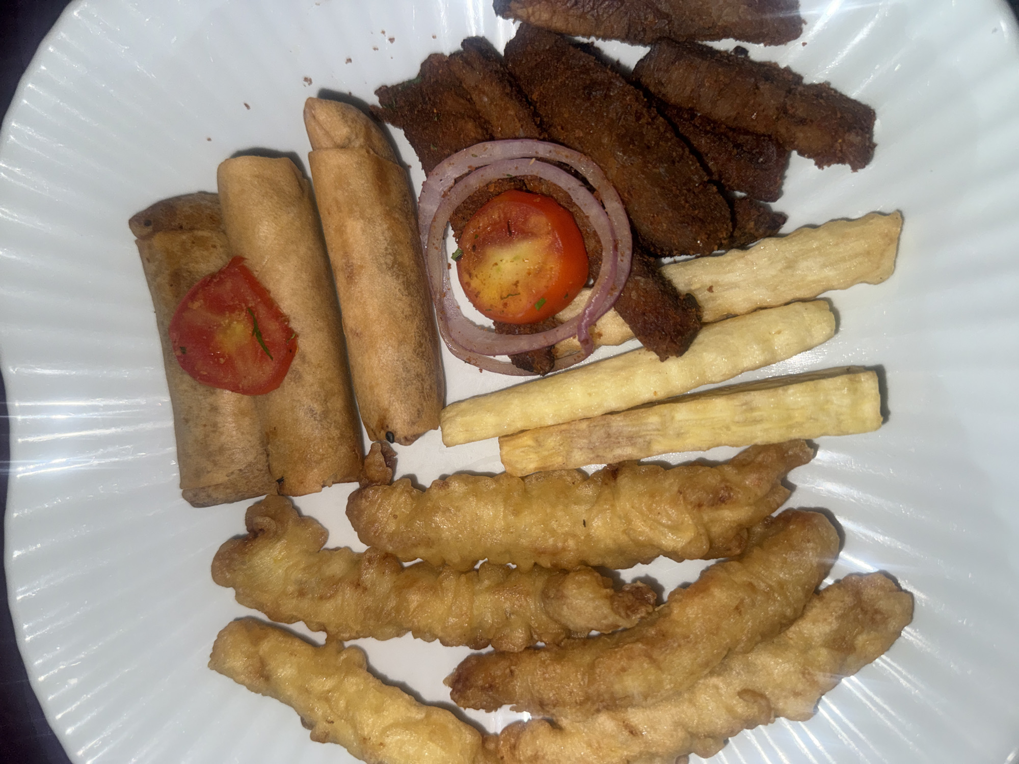 The image depicts a white plate with various fried food items arranged on it. These include spring rolls, fried yam sticks, fried fish, a tomato slice topped with a ring of red onion, and fried plantain slices. The location is suspected to be in Lekki, Nigeria.