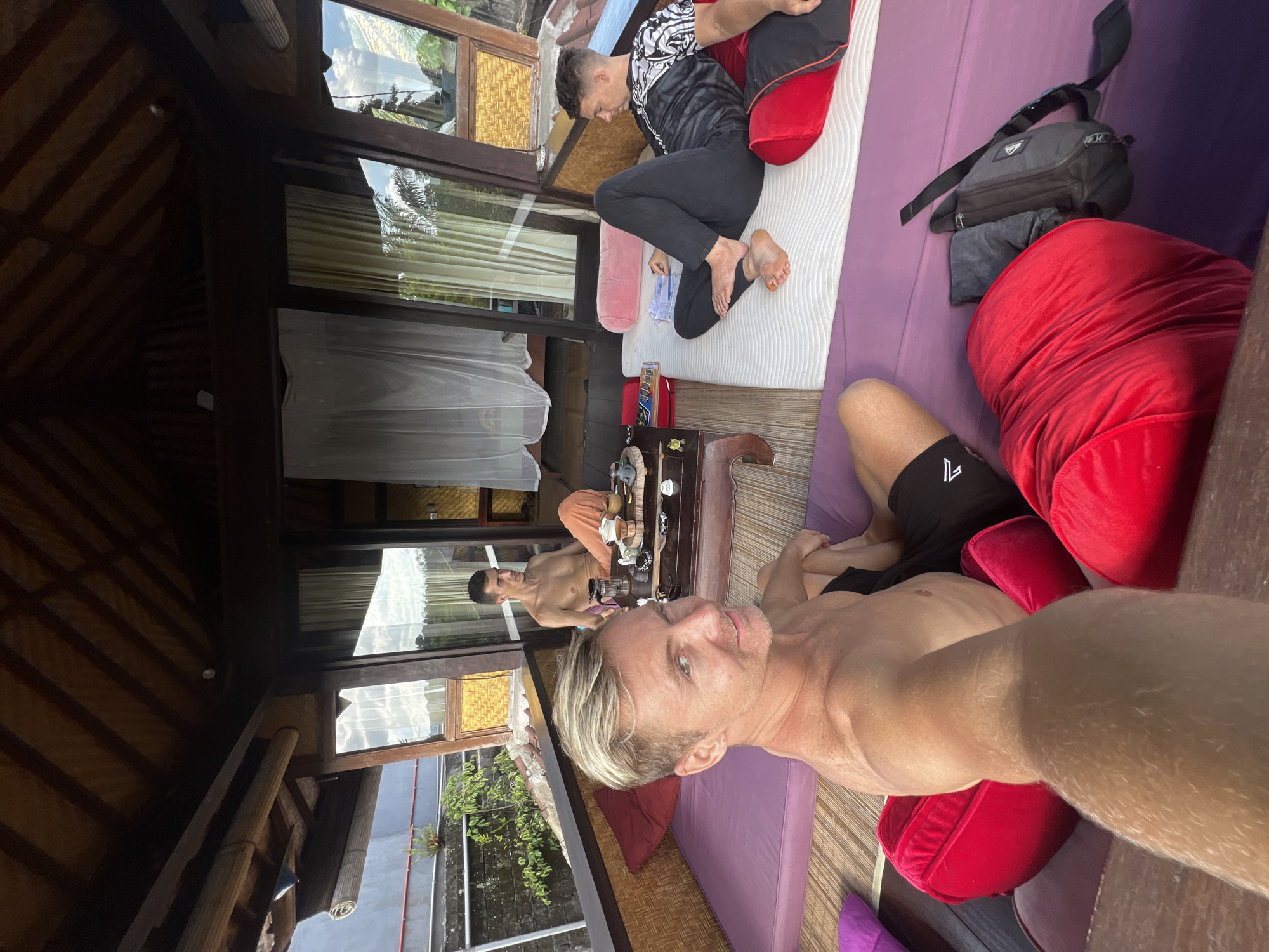 A man with blond hair is taking a selfie indoors, lying on a purple mattress with red pillows. He is wearing black shorts with a white logo. Behind him, another man sits on a cushioned area near a low table with tea and cups, suggesting a tea or coffee ceremony. Through open doors, vegetation and a glimpse of a building with white walls are visible, indicating an outdoor setting. Another man is sitting on a mattress and looking away. Based on the architectural style and lush surroundings, the location is likely in Ubud, Indonesia.