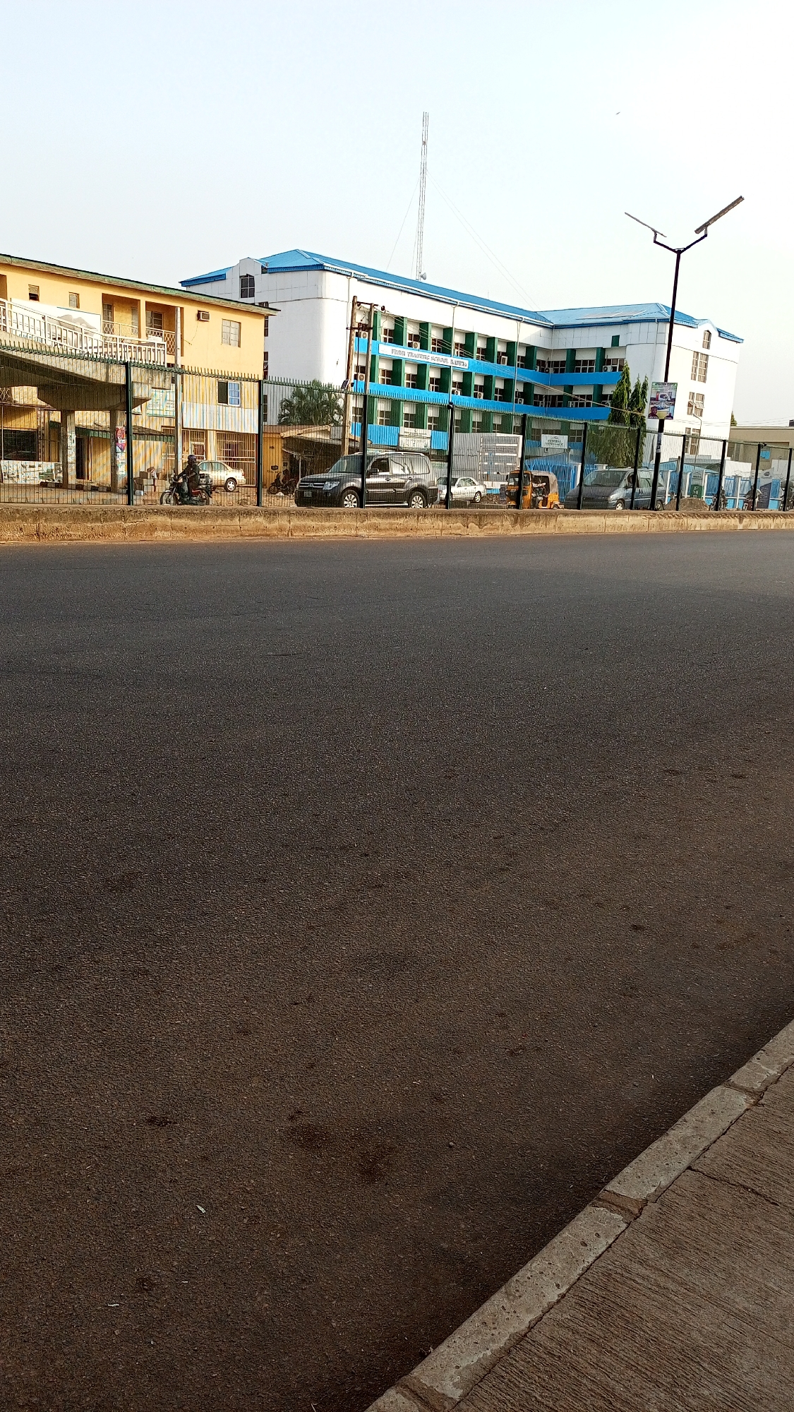 The scene is a street in Unguwar Sarki, Nigeria. The focus is an asphalt road, extending from the foreground to the midground. A concrete curb is visible on the right edge of the image, delineating the boundary of the road. Across the road, behind a black metal fence, various vehicles are parked including a dark SUV and a yellow tricycle ("Keke"). A pedestrian bridge connects a yellow building on the left to a larger, white building on the right, which has blue and green accents and signage indicating "Kaduna Traffic School". A communications tower rises from the top of the building. A few pedestrians and motorcyclists are present on the near side of the road behind the fence. A street lamp is visible on the right.