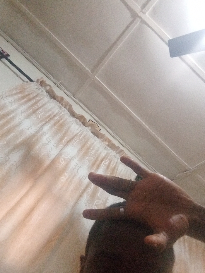 The image captures an indoor scene from a low, upward-looking perspective within the city of Unknown, Unknown. The top of a person's dark-haired head is visible in the lower foreground. A dark-skinned right hand is positioned above the head, with the thumb, index, and middle fingers extended upwards and slightly splayed; a metallic ring is worn on the index finger. To the left, a light-beige or cream-colored curtain with a subtle, repeating patterned design is visible, gathered at its top edge. The upper portion of the frame shows a white or off-white ceiling featuring a recessed grid pattern. A ceiling-mounted light fixture or a portion of a ceiling fan is present in the upper right corner, emitting a bright light.