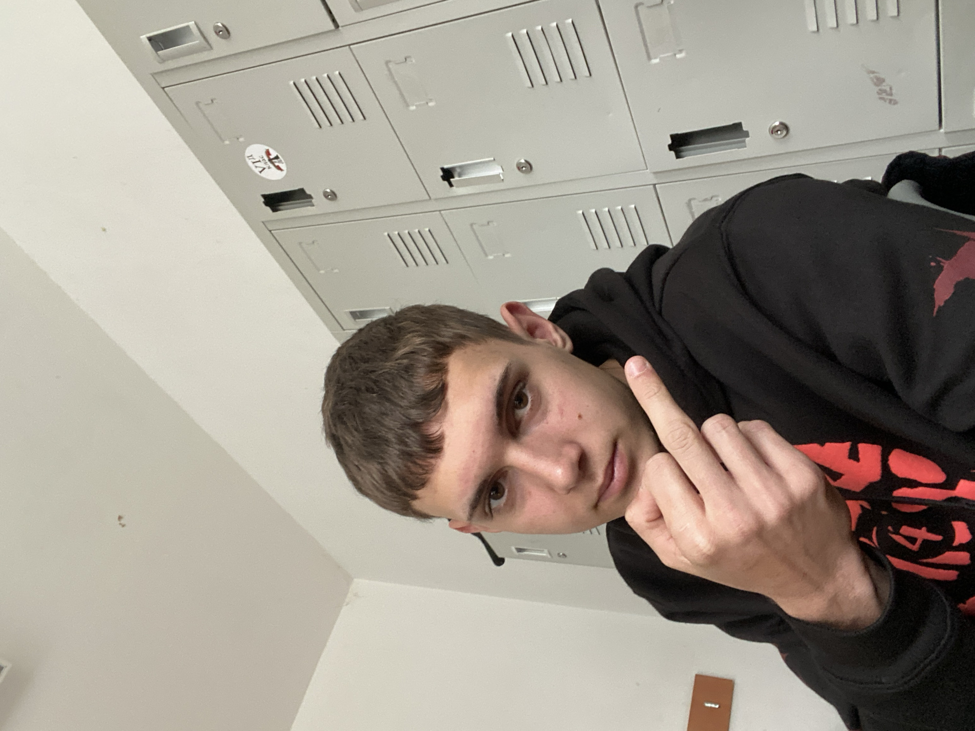 A young man with short brown hair is positioned in front of a series of grey metal lockers. He is wearing a black hooded sweatshirt with a red graphic design. He is raising his middle finger. A small, round sticker is visible on one of the lockers in the background. The location is assumed to be Varna, Bulgaria.