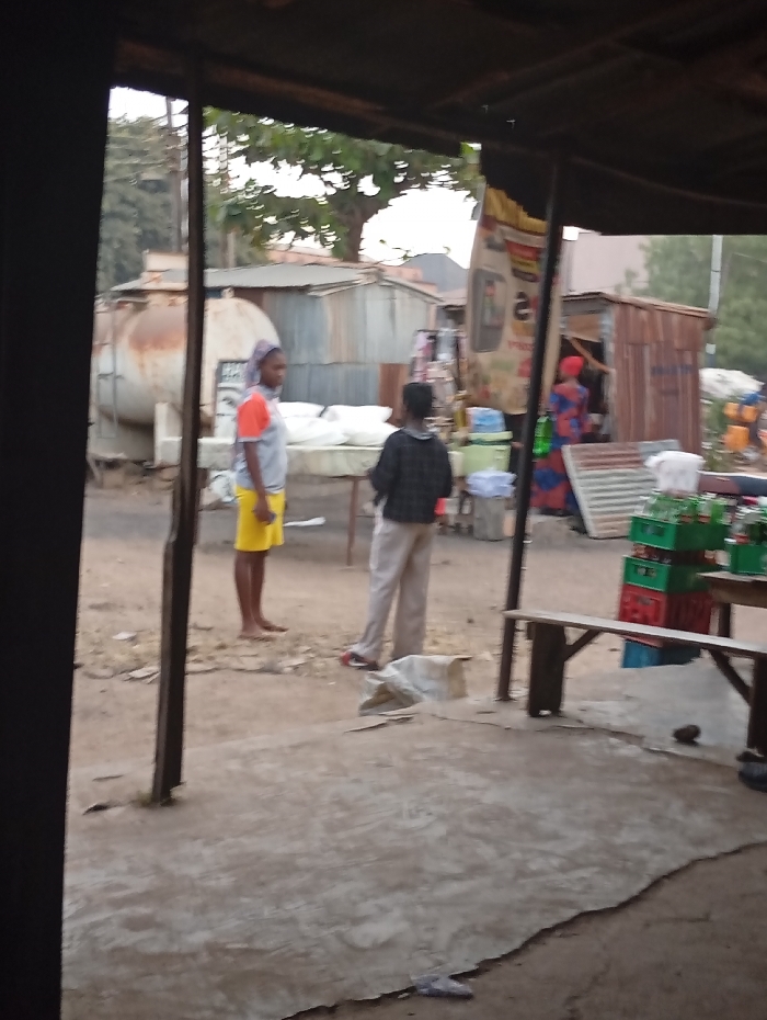 The image depicts an informal outdoor commercial or residential scene in Zaria, Nigeria, viewed from under a dark-roofed structure supported by dark posts