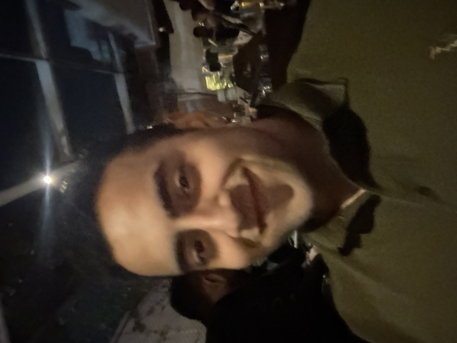 A blurry selfie featuring a person wearing skeleton-like makeup with dark circles around the eyes and a darkened mouth area. The person is wearing a green garment. In the background, there are indistinct figures of people and blurred lights. The photo has a grainy quality and is rotated to the left.