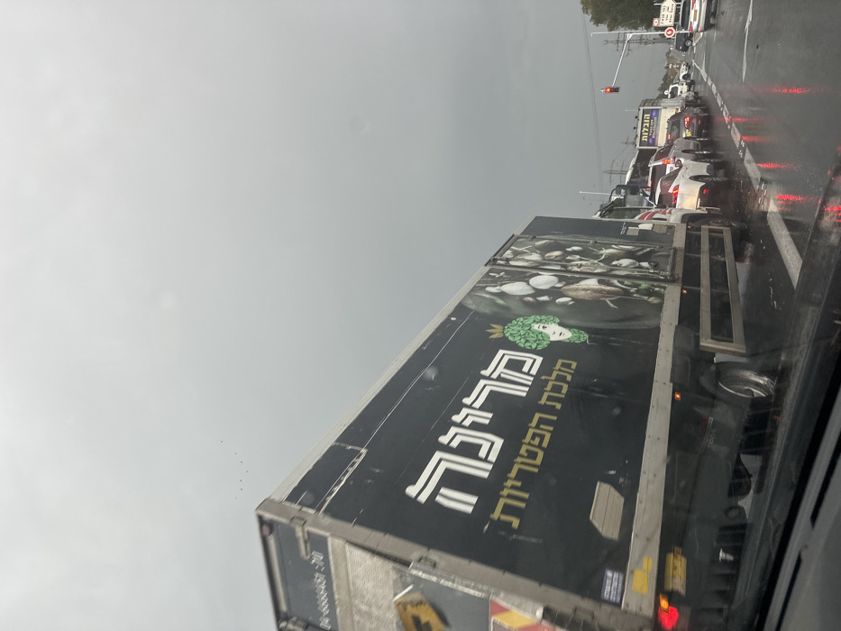 A black truck with Hebrew writing "מירקה מלכת הפטריות" (Mirka, Queen of Mushrooms) and an image of mushrooms is on the road. The truck's rear depicts more mushroom images. Traffic is heavy with multiple cars lined up ahead. The sky is overcast and gray, suggesting a rainy day. The scene is viewed from inside a vehicle, likely stuck in the traffic.