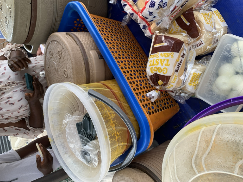The image displays a close-up view of a food vendor's stall or market stand in Igando Oloja, Nigeria