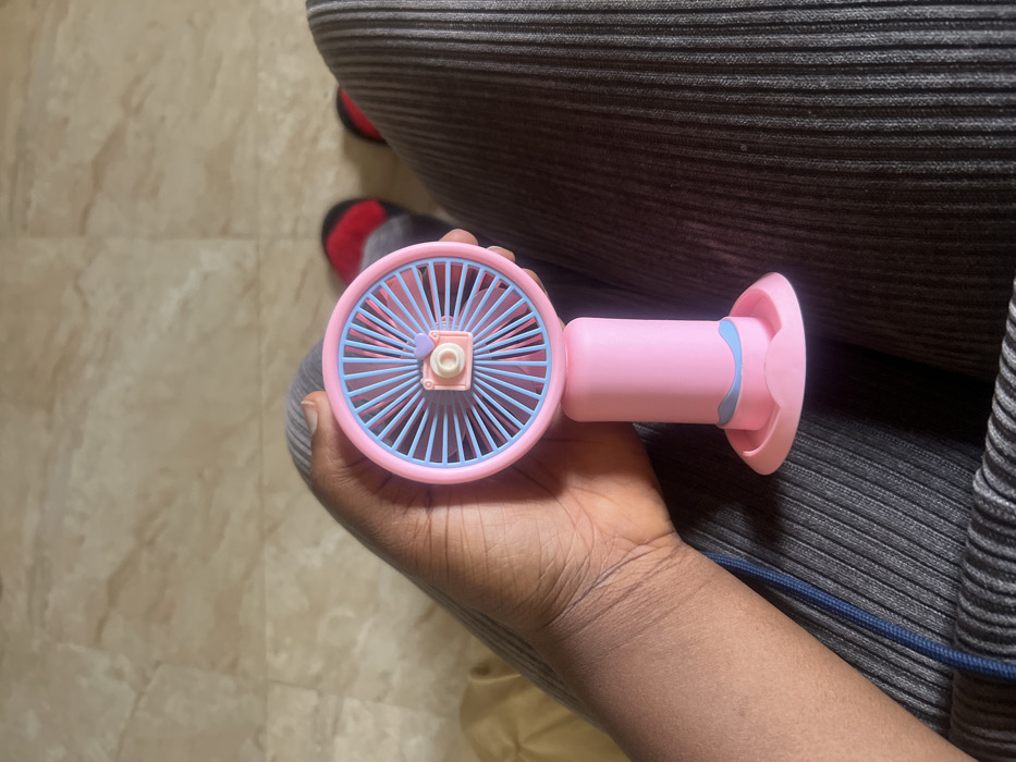 In Dutse, Nigeria, a close-up, high-angle perspective captures a person holding a pink and blue portable fan