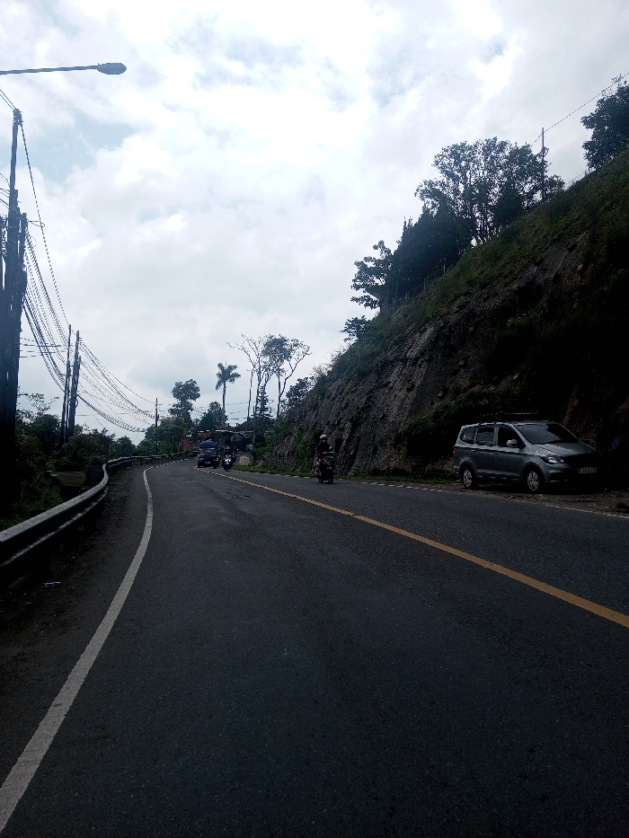 This image displays a two-lane asphalt road curving gently to the left under an overcast sky in Kalchini, India. A solid white line marks the left edge of the road, bordered by a metal guardrail. Multiple utility poles strung with numerous black cables are visible on the far left, with one pole supporting a street light fixture extending over the roadway. On the right side of the road, a broken yellow line delineates the center. A steep, rocky hillside covered with sparse vegetation and trees rises sharply along the right edge of the road. A grey minivan equipped with a roof rack is parked on the dirt shoulder at the base of this hillside on the right. On the road itself, a motorcyclist wearing a helmet is visible in the mid-ground, traveling away from the viewer. Further down the road, additional motorcycles and a larger vehicle (possibly a truck or bus) are present. Various trees, including a distinctive palm tree, are scattered across the landscape in the mid-distance.