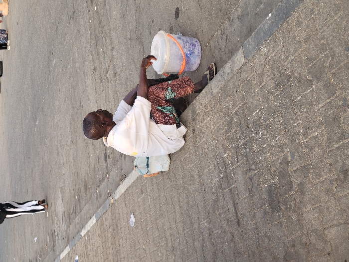 A person sits on the side of a weathered street, next to a curb made of patterned concrete blocks. They wear a white shirt, printed pants, and sandals. Next to them is a white plastic bucket with an orange handle. The street surface is gray and marked with stains and lines. Another person wearing striped pants is visible at the edge of the frame.