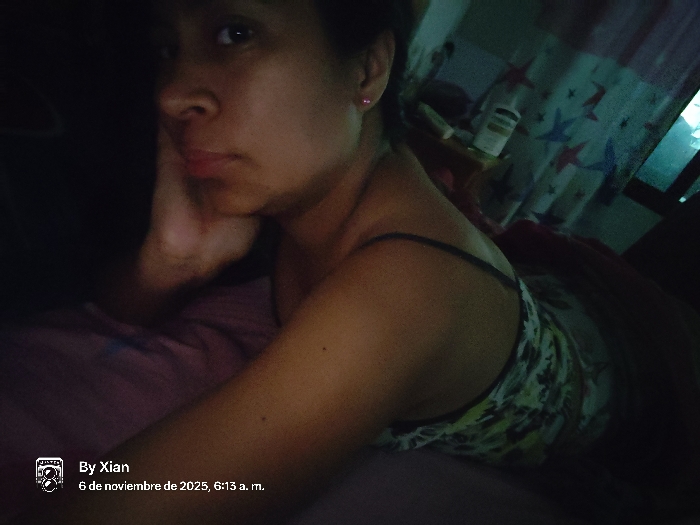 The image displays an adult female in a dimly lit indoor environment, likely a bedroom, captured in a close-up, diagonal orientation. The subject, exhibiting a medium complexion, is positioned on her left side, resting her chin on her bent right hand. She wears a light-colored, patterned camisole with thin black straps and a small pink stud earring in her visible left earlobe. Her facial expression is neutral. To the right of the subject, the background features a light-colored bottle on an indistinct surface, situated in front of a blue-toned curtain patterned with red and white/light-colored stars. Further right, a window or opening exhibits a distinct blue-green ambient light. The bedding beneath the subject is a solid purple or dark pink. The left side of the image is predominantly in shadow. An embedded watermark indicates "By Xian 6 de noviembre de 2025, 6:13 a. m." No specific visual cues are present in the image to identify its precise location within the city of Cali, Colombia.