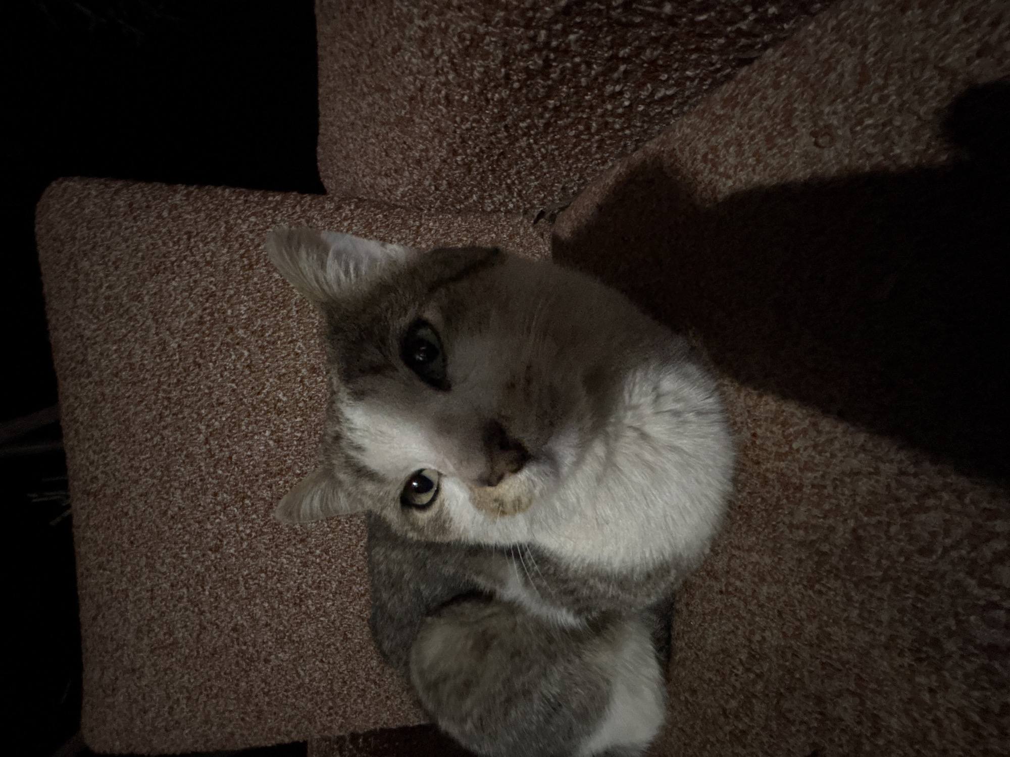 The image depicts a domestic cat resting on an upholstered armchair in Slavyanovo, Bulgaria. The cat exhibits a white and grey tabby pattern, featuring a distinctive light brown patch on the right side of its muzzle. Its greenish-yellow eyes are directed towards the viewer. The animal is in a curled, loaf-like posture on a textured, reddish-brown fabric surface. The scene is captured under low-light conditions, with a direct light source illuminating the cat's face and casting a prominent dark shadow onto the lower right section of the chair. The background is uniformly dark and devoid of discernible features, indicating a low-light environment or nighttime.