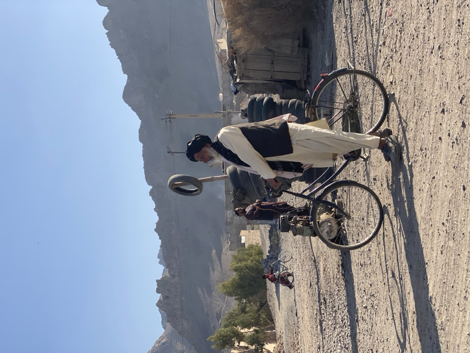 The image captures an outdoor scene in Deh Sabzi, Afghanistan, under a clear blue sky with harsh daylight casting distinct shadows. In the foreground, an elderly man with a white beard, dressed in a light-colored shalwar kameez, a dark waistcoat, a black turban, and a striped scarf, stands beside a dark-colored bicycle. The bicycle features a small engine-like attachment on its frame. The man holds the bicycle and faces towards the right side of the frame. To his left, another adult male in dark attire stands in the midground, looking towards the main subject. Further left, a child on a smaller bicycle is partially visible on the unpaved, gravelly dirt ground. In the background, a large stack of black rubber tires is visible, along with a utility pole and a vertical post topped with a single tire. Basic structures constructed from wood and other materials, alongside dry vegetation, populate the midground. Barren, rocky mountains dominate the distant background.