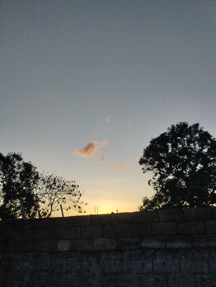 A twilight sky with a faint sunset glow peers through a silhouette of trees. A brick wall occupies the lower portion of the scene, obscuring the ground. Two trees stand on either side, their shapes stark against the fading light. A few wispy clouds drift in the sky above the trees. The light fades at the horizon where the sun sets.