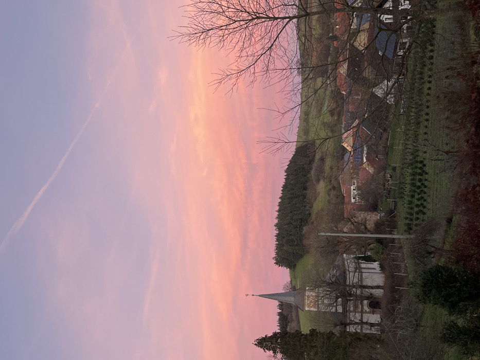 A vibrant pink and purple sky dominates the scene, with wispy clouds hinting at sunset. In the foreground, a church steeple rises above trees, with a half-timbered building nearby. A line of trees and a hillside village nestle along the edge of the frame. Bare branches add a stark contrast against the colorful sky, while a faint contrail slices through the upper left.