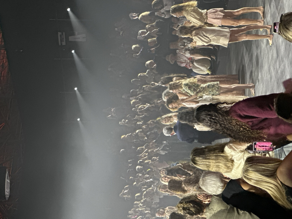 The image displays an indoor event, likely a fashion show or presentation, within a large venue in Tel Aviv, Israel. The scene is dimly lit overall, with multiple powerful spotlights cutting through a visible haze or smoke, illuminating a dark stage or runway in the mid-ground. In the foreground, the backs of several individuals are visible, indicating their position as audience members or photographers; at least two are holding smartphones, one with a pink phone case. On the dark stage/runway, approximately 10-15 women stand barefoot, positioned in various groupings. They are dressed in a range of light-colored, casual-elegant attire, including dresses (some floral, some plain), and two-piece sets like shorts with a matching top. Several of these women are smiling and clapping, facing towards the audience. A man in a dark suit jacket and light shirt is seen from behind, standing centrally among the women on the stage. In the background, a large audience occupies tiered seating or standing areas, extending upwards and backwards into the darkness. Many audience members are holding up smartphones to record or photograph the event. Overhead, the dark ceiling shows visible structural beams and lighting rigs. A white banner displaying the partial text "A-" is discernible in the upper right portion of the background. The ambiance suggests a concluding segment of a professional, large-scale public gathering.