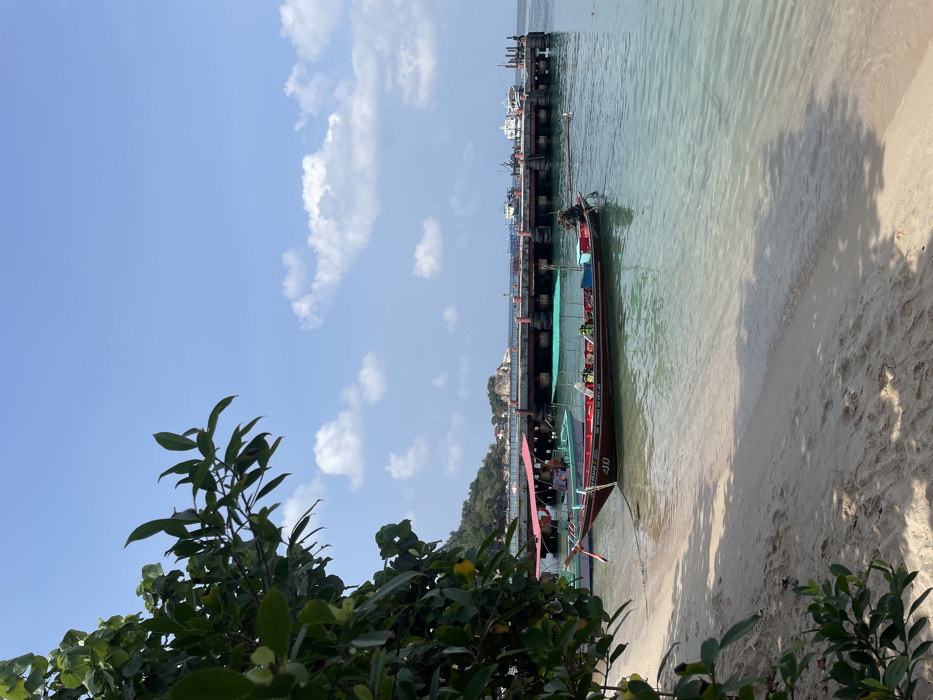 tropical beach scene with a long pier extending into the clear turquoise water. Several traditional Thai longtail boats are docked near the pier, painted in vibrant colors. Sandy beach stretches along the coastline. Green foliage frames the bottom of the image, while a blue sky with scattered clouds provides a backdrop.