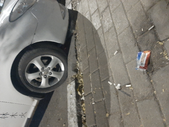 The image displays an urban night scene in Barza Municipality, Syria. The lower front section of a light-colored vehicle, featuring a silver five-spoke alloy wheel, is parked near a concrete curb. Three vertical characters, identified as "休木火", are visible on the side panel above the front wheel. The vehicle casts a distinct shadow onto the adjacent sidewalk. The sidewalk is paved with grey rectangular blocks. Scattered across the paving stones are numerous discarded cigarette butts and a single crumpled snack wrapper, predominantly red and blue in color. A few dried leaves are also present on the sidewalk. No individuals are visible in the frame.